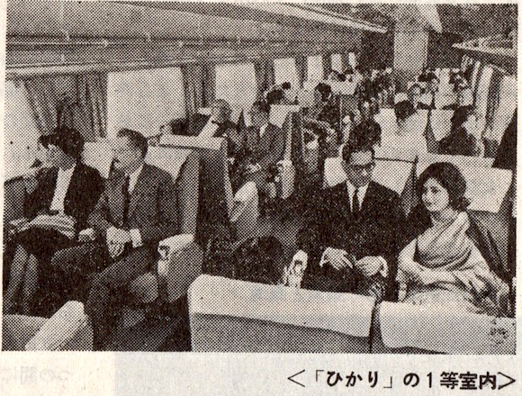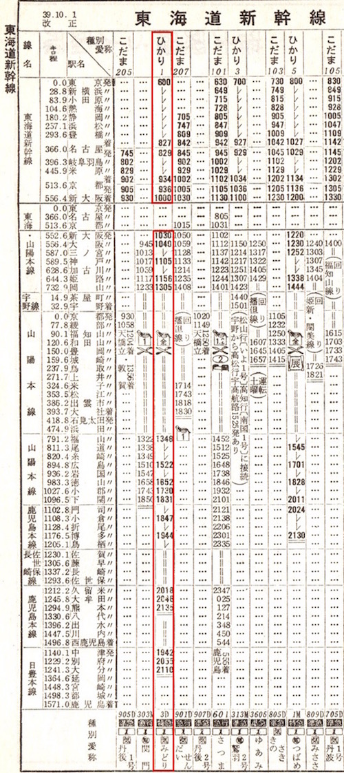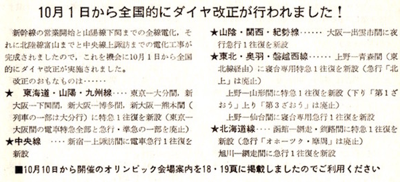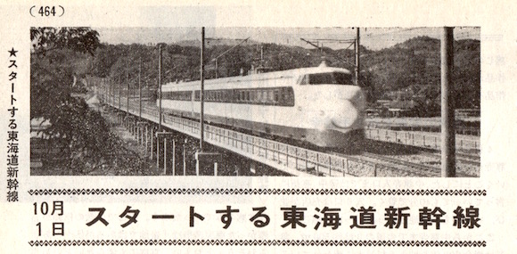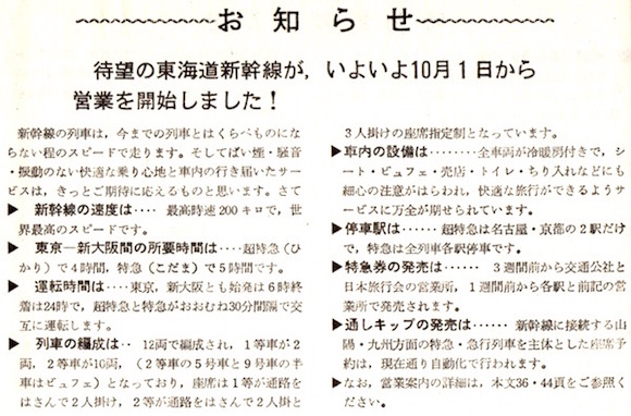 (1964年9月号では、東京を7時に出発する特急こだま1号に乗ると大阪着が13時30分。特急みどりに乗り換えて博多着22時35分。所要時間は15時間35分。東海道新幹線の開通で1時間51分の短縮になっています。)