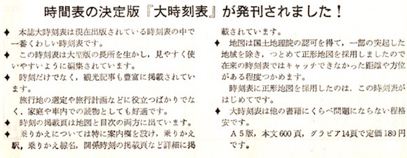 この「大時刻表」はこの号から発刊されたようです。現在のJR時刻表の前身のようです。それまでの交通公社の時刻表よりもサイズが一回り大きいので「大」時刻表となったのでしょう。