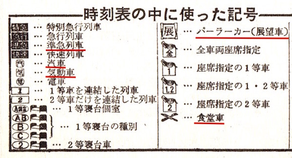 記号の説明です。2020年3月の時刻表にないものは、準急列車、汽車、気動車、電車、パーラーカー(展望車)などです。ベッドのマークは寝台車です。「A個室」は1等寝台個室、「A,B,C」は1等寝台の種別ということです。「2」が2等寝台なので最近のB寝台に相当するのでしょう。食堂車もこの当時はたくさんあったようです。