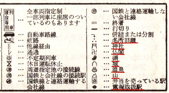 名所旧蹟や神社や仏閣の記号もあったのですね。そして湖、城、温泉、山、駅弁取り扱い駅の表示もあります。電報取扱駅の記号があるとは時代を感じさせます。