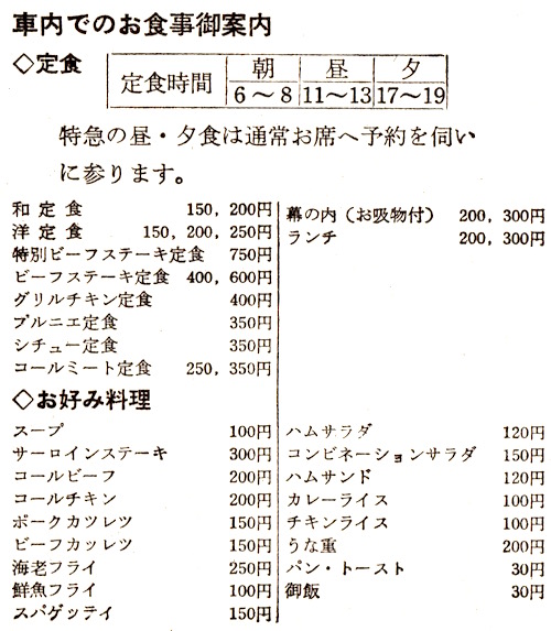 定食では、特別ビーフステーキ定食が750円です。この時刻表の値段が180円で、最近は税込1205円ですから、物価が約7倍になっているようです。そうすると5000円を超えることになります。美味しかったことでしょうね。