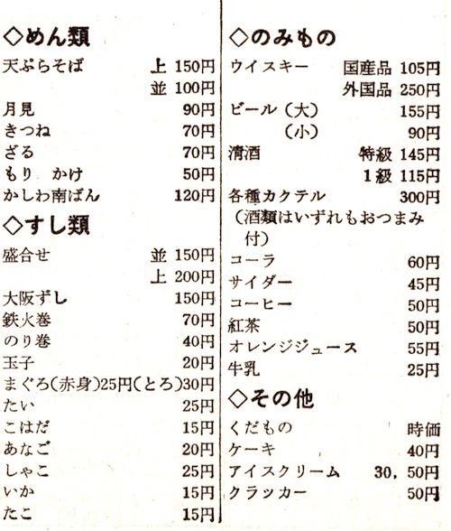 めん類もありますが、すし類もあったのですね。それも単品で注文できたようです。くだものは時価ってなんだか高そうです。