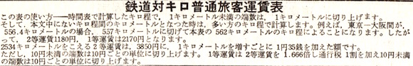 「この表の使い方ー時間表(注:時刻表のことでしょう)で計算したキロ程で、1キロメートル未満の端数は、1キロメートルに切り上げます。そして、本文中にないキロ程間のキロメートルとなった時は、多い方のキロ程で計算します。例えば、東京ー大阪間が、556.4キロメートルの場合、557キロメートルに切り上げて本表の562キロメートルのキロ程によることになります。したがって、2等運賃1180円、1等運賃は2170円となります。2534キロメートルをこえる2等運賃は、3850円に、1キロメートルを増すごとに1円35銭を加えた額です。ただし、10円未満の端数は10円ごとの単位に切り上げます。1等運賃は2等運賃を1.666倍し通行税1割を加え10円未満の端数は10円ごとの単位に切り上げます。」と記載してあります。