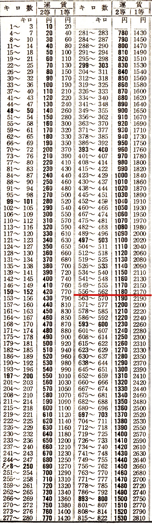 運賃はこのようになっています。2021年7月号の時刻表の運賃表と2等運賃を比べてみましょう。