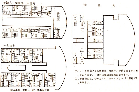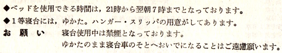 「◆ベッドを使用できる時間は、21時から翌朝7時までとなっております。 ◆1等寝台には、ゆかた・ハンガー・スリッパの用意がしてあります。 お願い  寝台使用中は禁煙となっております。ゆかたのまま寝台車のそとへおいでになることはご遠慮願います。」