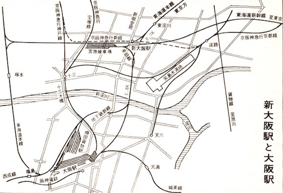 新大阪駅のすぐ北側には京阪神急行(現在の阪急電鉄)新線と書かれています。この頃から計画にあったのですね。今でもこの細長い土地は駐車場などとして残っていると思います。