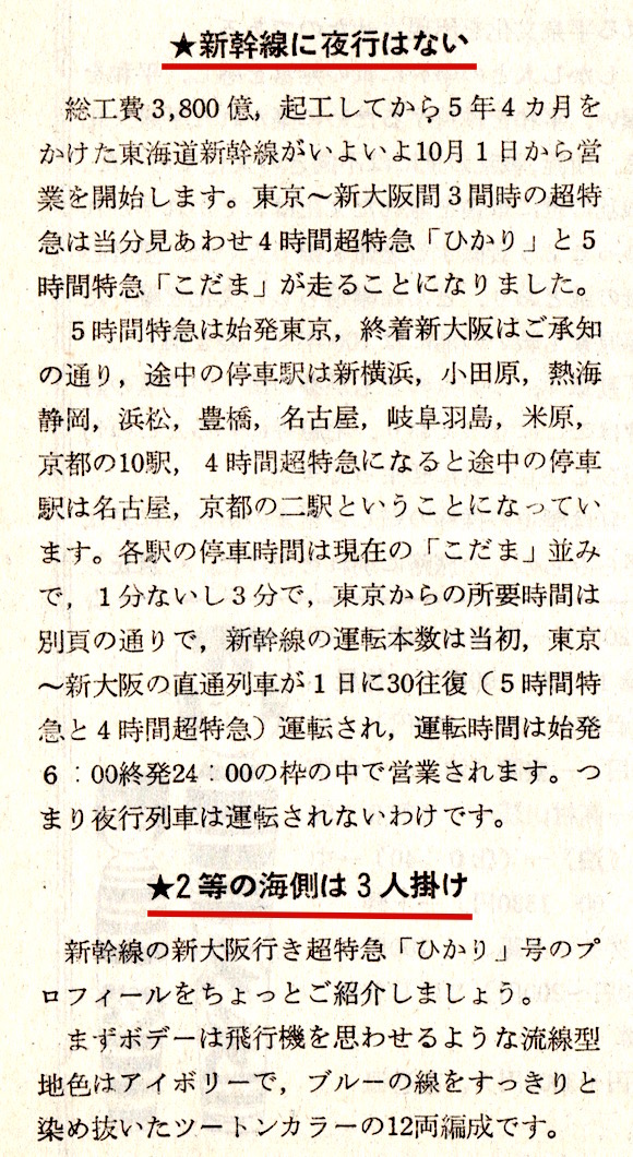 まず「新幹線に夜行はない」と書いてあります。夜行列車が数多く走っていた頃なので、このような表現になったものと思われます。次に「2等の海側は3人掛け」と書いてあります。1等がグリーン車で、2等は普通車です。海側は3人掛けは今となっては当たり前のように感じますが、この頃は3人掛けは珍しかったのでしょう。