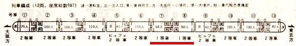 新幹線の列車編成です。今では16両ですが、当初は12両でした。1等車(グリーン車)は2両あり、ビュフェも2カ所ありました。