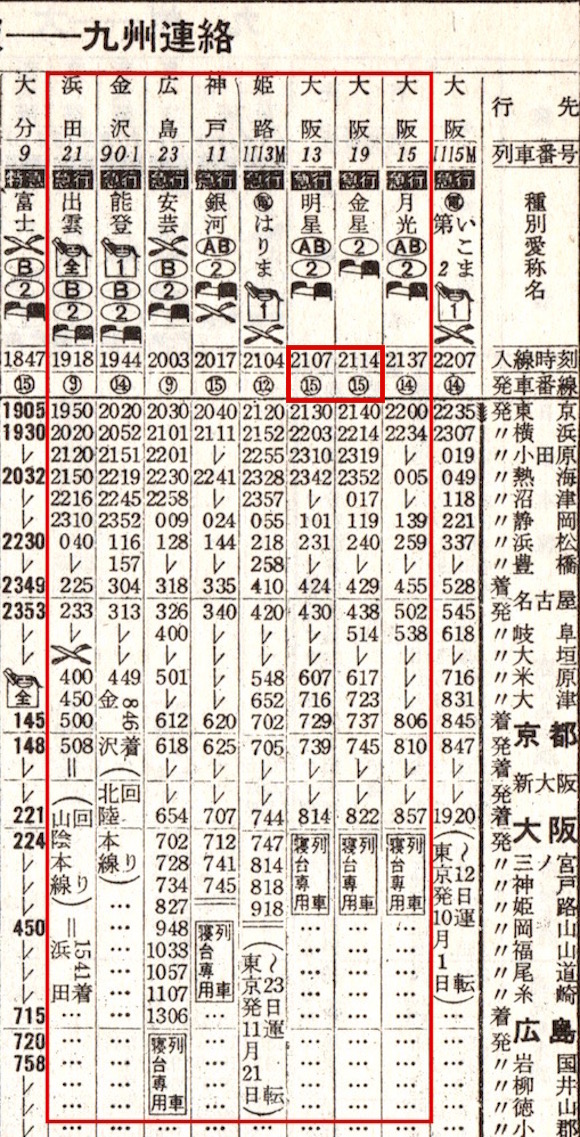 寝台特急5種類が出発する前にも、東京発の寝台急行は霧島、雲仙・西海、高千穂とありますが、寝台特急出発後も、寝台急行出雲、能登、安芸、銀河、明星、金星、月光などが続々と出発していきます。寝台急行能登はこの頃は米原経由だったのですね。