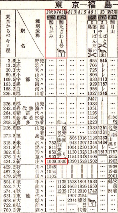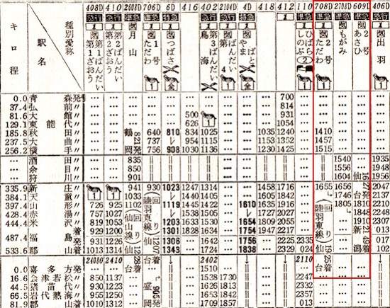 わかりにくいなぁ、と思い時刻表をひっくり返していたら311ページに「準急 あさひ号・月山号・もがみ号・たざわ号 運転略図」という図がありました。これを見ればわかるかなぁ、、、、、、なんだか複雑でわかりにくいですね。この時代の人はこれでわかっていたのでしょうか?  不思議です。