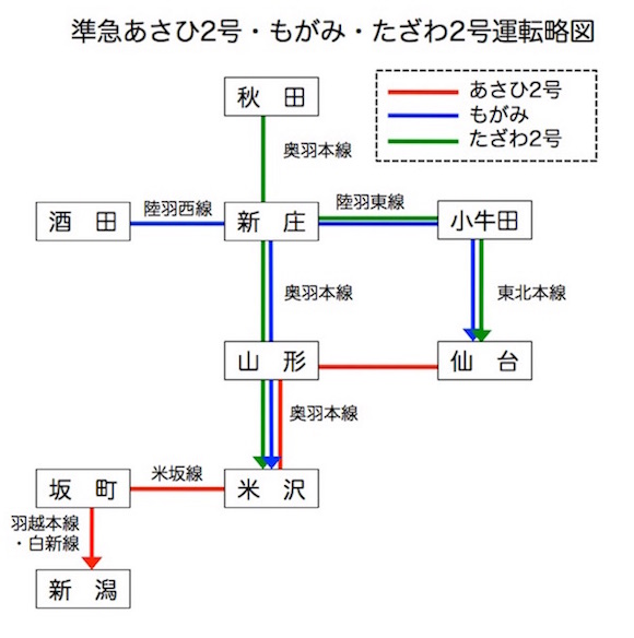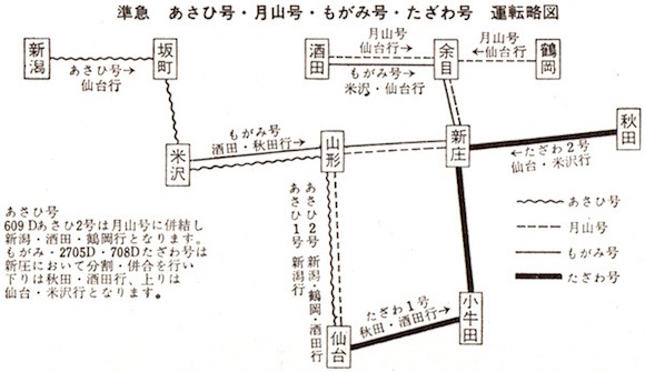こちらは準急たざわ(「ただわ」は誤植)2号・もがみが新庄で、そしてもがみ・あさひ2号が山形で分割併合するようです。かなり複雑な運行体系になりますね。