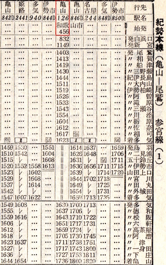 那智は名古屋から関西本線、亀山からは紀勢本線となります(今度も紀「井」勝浦となっています)。一方、伊勢・大和は亀山で分離します。伊勢は紀勢本線・参宮線で鳥羽へ、大和は関西本線で湊町を目指します。
