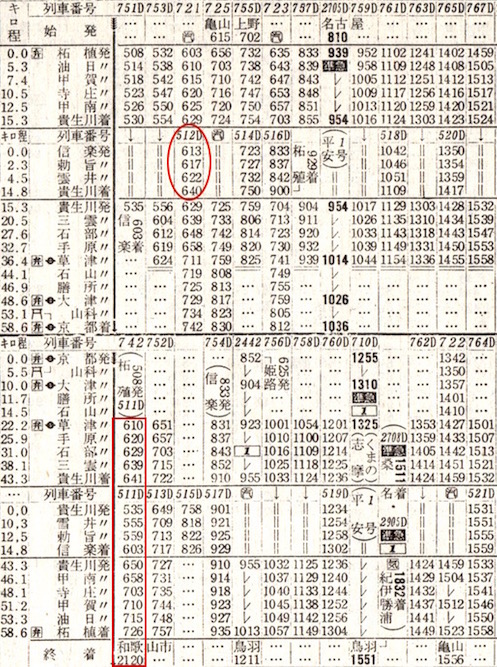 草津線のページを見てみましょう。確かに6時10分に草津を出発しています。貴生川では信楽発6時13分の列車(赤丸)と連絡しています。そして柘植には7時26分に到着します。柘植から亀山までの3駅は関西本線を走ります。