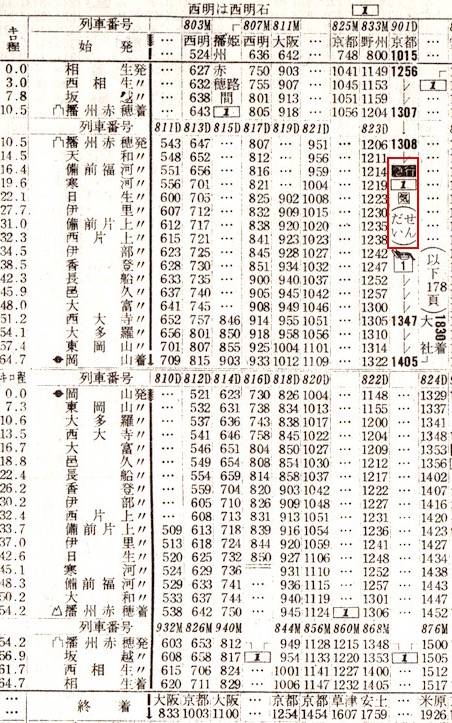 赤穂線にも急行が走っていました。急行だいせんです。京都を10時15分に出発し東海道本線・山陽本線を走り、相生から岡山までは赤穂線を利用します。