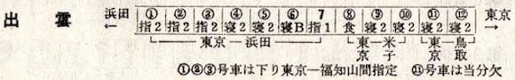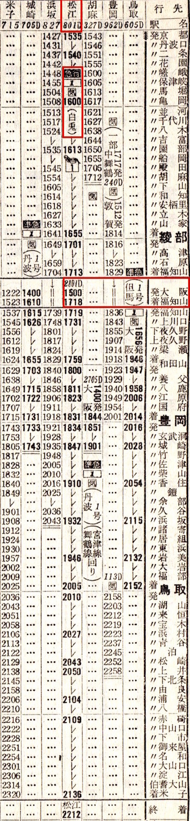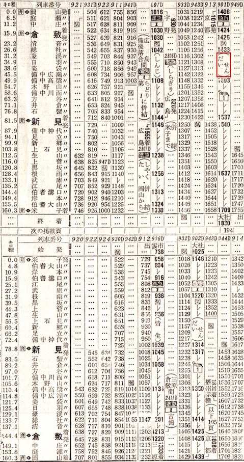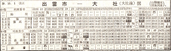 福知山を0時23分と夜中に出発しますが、その後も和田山・豊岡・城崎(現:城崎温泉)・浜坂・鳥取・上井(現:倉吉)・大山口とこまめに停車し、米子着は5時18分です。終点出雲市へは6時44分に到着し、大社までは普通列車です。全国あらゆるところに夜行列車が走っていたのですね。