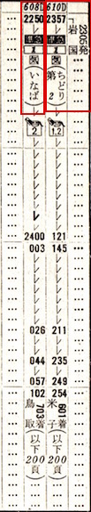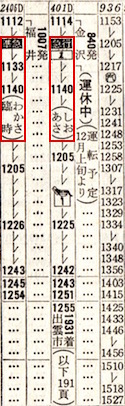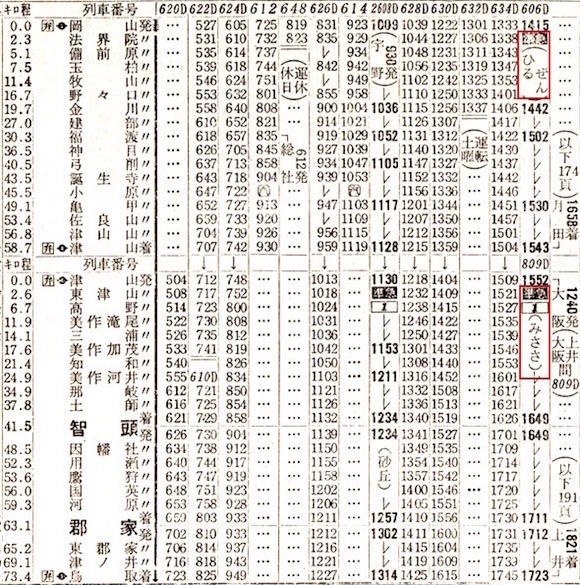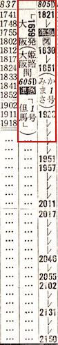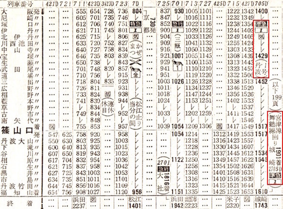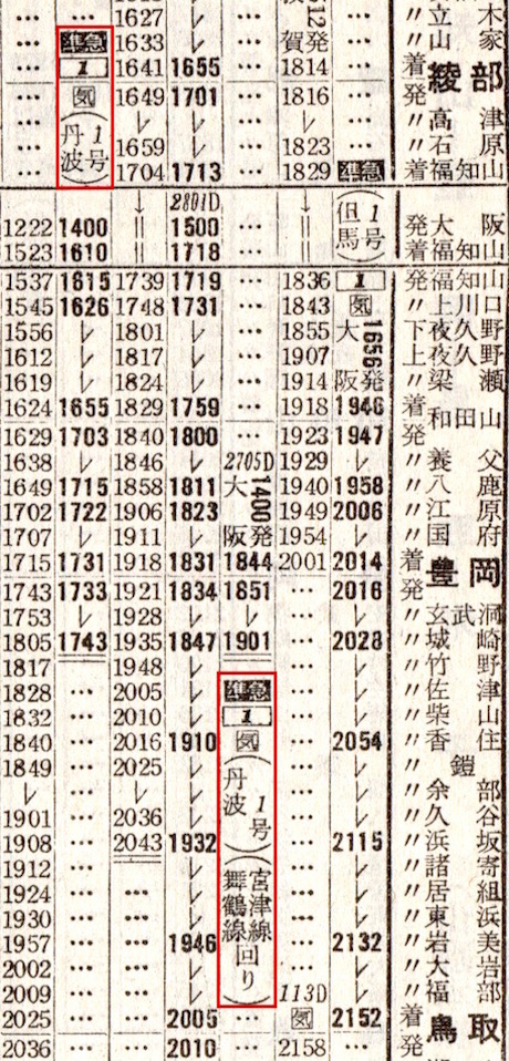準急丹波1号は大阪14時ちょうど発で城崎(現:城崎温泉)に17時43分に到着します。しかしその右側にも準急丹波1号があり、大阪14時ちょうど発で城崎には19時01分に到着します。いったいどういうことなのでしょうか。