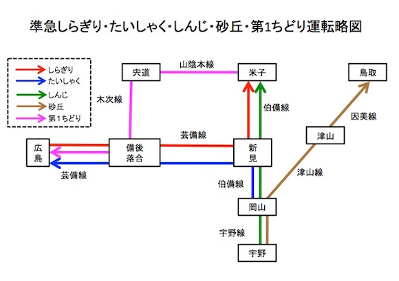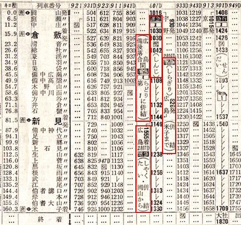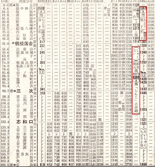 ここまでならわかりやすいのですが、しかし、岡山14時15分発の準急ひるぜんが津山で二つに分離され、一方はみささと併合し鳥取方面へ、もう一方はみまさか2号と併合し新見方面へと行くのです。