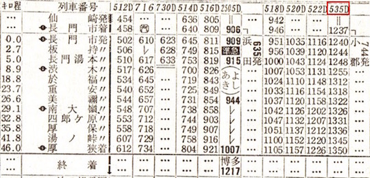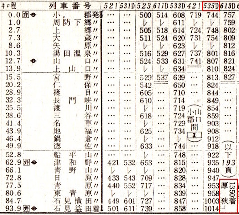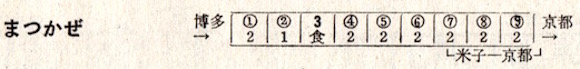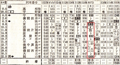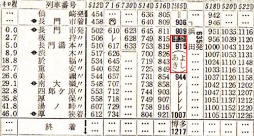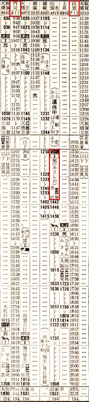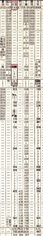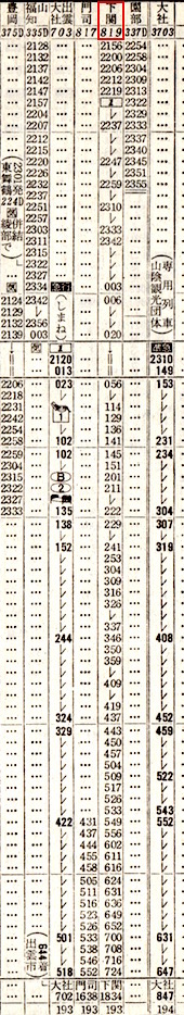 上井(現:倉吉)4時31分発で門司着16時38分です。のんびりと景色を眺めながらの旅にはもってこいですが、お尻が痛くなりそうですね。4時31分出発って早すぎるよなぁ、と思って時刻表を見ると、寝台急行しまねが4時22分に上井に到着しています。しまねからの乗り換え客には便利な設定です。