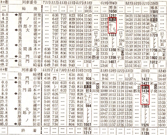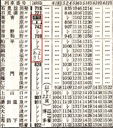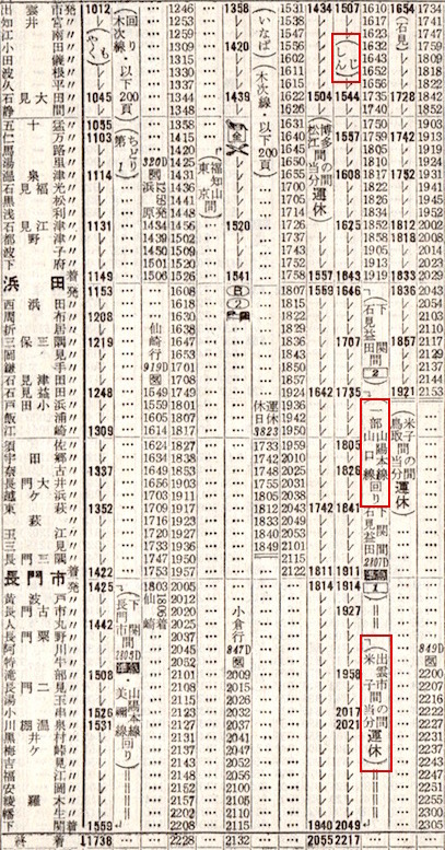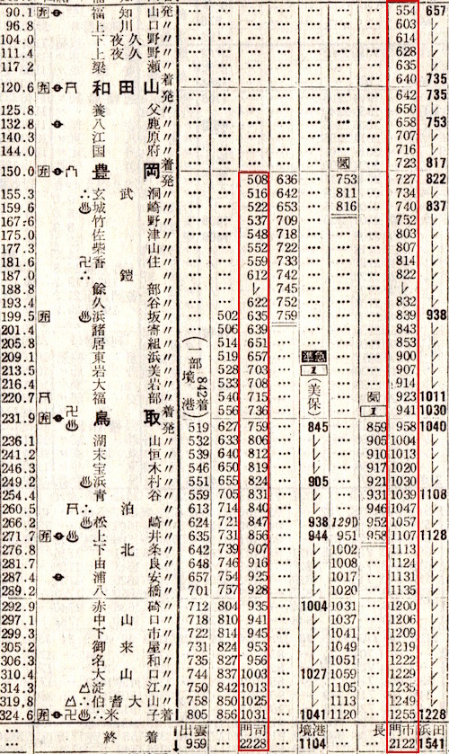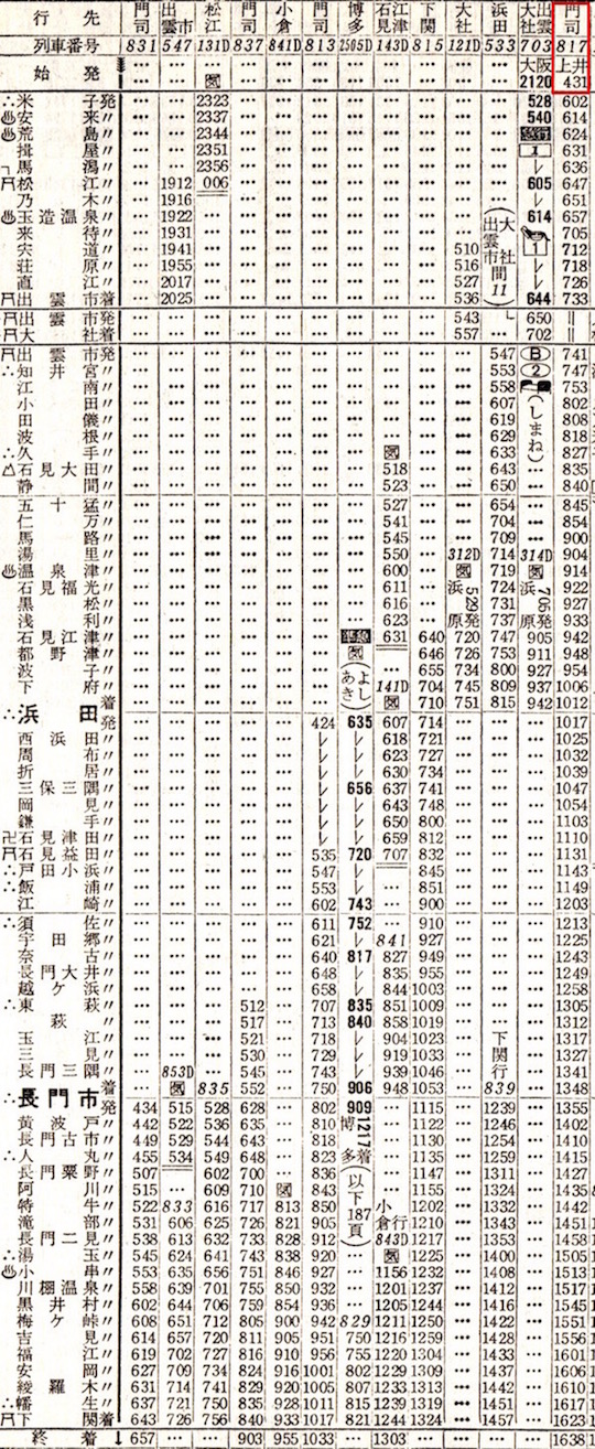 松江から下関までは時刻表には掲載されています。米子からは松江・出雲市・石見大田(現:大田市)・浜田・石見益田(現:益田)・東萩・長門市・下関のみに停車します。