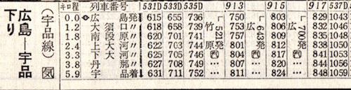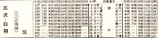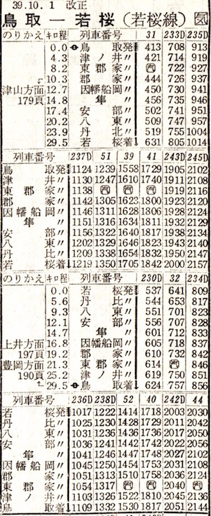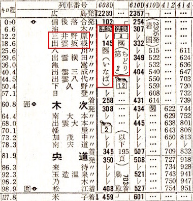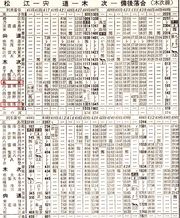 準急列車が3本も走っています。2020年(令和2年)3月の時刻表では木次線には優等列車はなく、出雲横田から備後落合まで定期列車は3本しかありませんが、1964年10月は出雲横田から備後落合まで準急を含め8本あります。亀嵩(かめだけ)駅は松本清張の砂の器にも登場する駅として有名です。