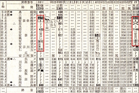 伊勢と大和は併合して22時45分に東京駅を出発します。伊勢の終点は鳥羽、大和の終点は湊町(現:JR難波)です。