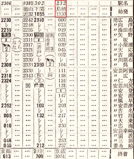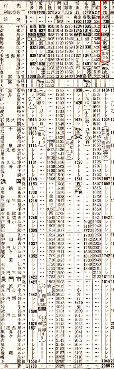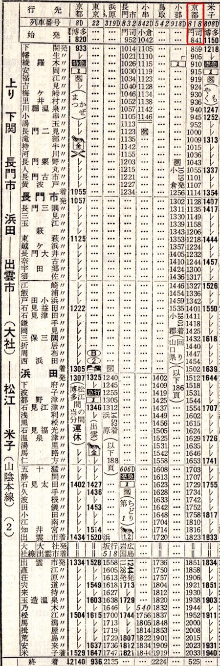 下りを見たらそれと同じ区間の上りは取り上げることはありませんでしたが、この列車だけは取り上げておきましょう。門司8時41分発、京都5時25分着の夜行普通列車です。長門市14分、出雲市28分と停車します。出雲市では博多からの準急やくもの到着を待っての出発です。所要時間は20時間44分です。乗ってみたいようなみたくないような、複雑な気持ちですね。