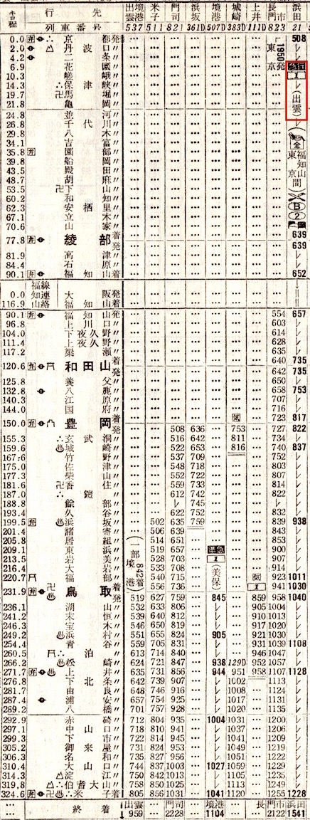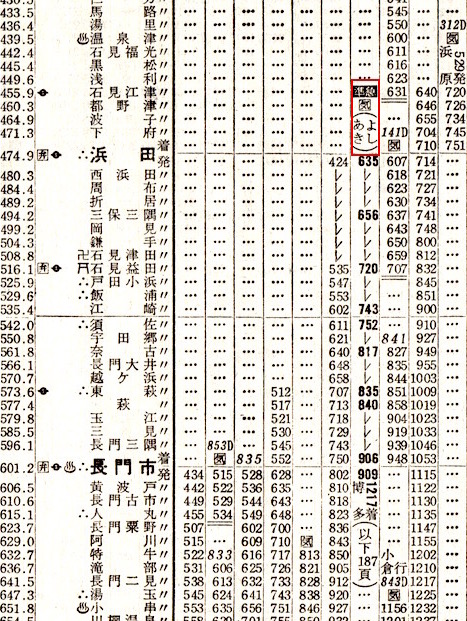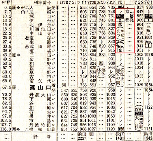 まだまだあります。5時28分京都発で山陰本線をずっと進み、石見益田(現:益田)に21時53分に到着します。途中で鳥取29分(因美線普通列車と接続)、米子33分(境線普通列車と接続)、浜田14分停車し、鳥取では特急まつかぜの通過待ちをし、米子では準急石見と接続しています。