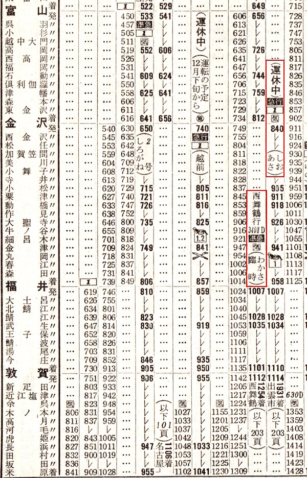 金沢を8時40分発の急行あさしおはいろいろな路線を経由します。まずは北陸本線で敦賀へ向かいます。福井からは準急臨時わかさ(西舞鶴行き)が同じ時刻で出ていますが、これは急行あさしおが運転されるまでの臨時列車なのでしょう。