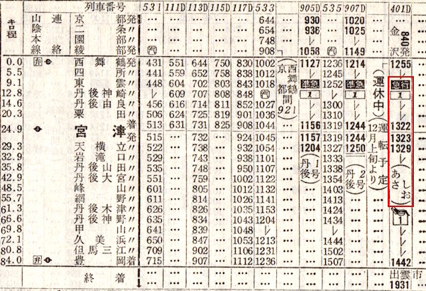 大阪からは福知山線に入り、福知山から山陰本線を走ります。京都を出て福知山までは大阪しか停車していません。大阪からの乗客を取り込みたいのでしょう。しかも全車指定席です。その後も、城崎(現:城崎温泉)・鳥取・上井(現:倉吉)・米子に停車するだけで、豊岡にも停車しません。すごい速達性です。