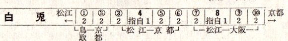 京都発15時35分の急行白兎は松江行きで22時12分に到着します。白兎とは因幡(いなば)の白兎の神話にちなんだものでしょう。しかし大阪発15時ちょうどの急行白兎もあります。大阪発は福知山線経由で福知山で京都発と併結されます。そして終点の松江を目指すのです。
