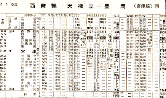 西舞鶴からは宮津線経由で宮津・天橋立に停車し、豊岡からは山陰本線に入ります。若狭湾をぐるっと一周することになります。このような経路の急行があったのですね。