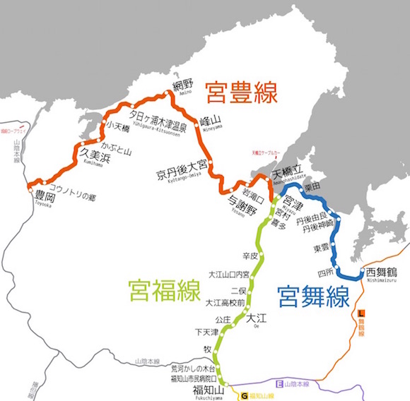 宮津駅を中心に、西舞鶴までを宮舞線、豊岡までを宮豊線、福知山までを宮福線と称しています。