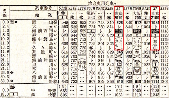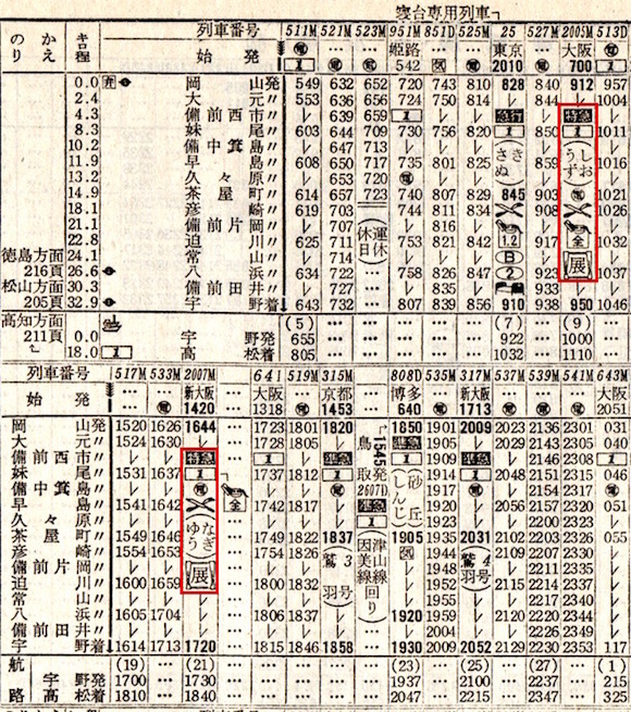 東京から宇野まで寝台急行さぬきと瀬戸が走っています。さぬきは寝台専用列車となっています。所要時間はさぬきは13時間ちょうど、瀬戸は14時間14分です。同じ寝台急行ですが、所要時間が1時間以上異なります。停車駅数が5つほど違うようなのでその差なのでしょうか。