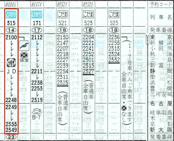 前述したように、東京21時ちょうど発のひかり315号(新大阪23時49分着)は「シンデレラエクスプレス」として有名になった「ひかり」です。当時の東京〜新大阪間の最短時間はこの列車の2時間49分でした。