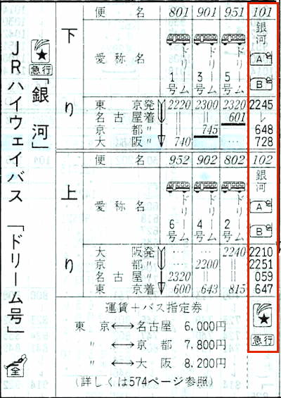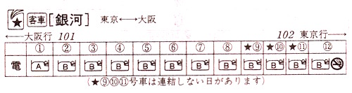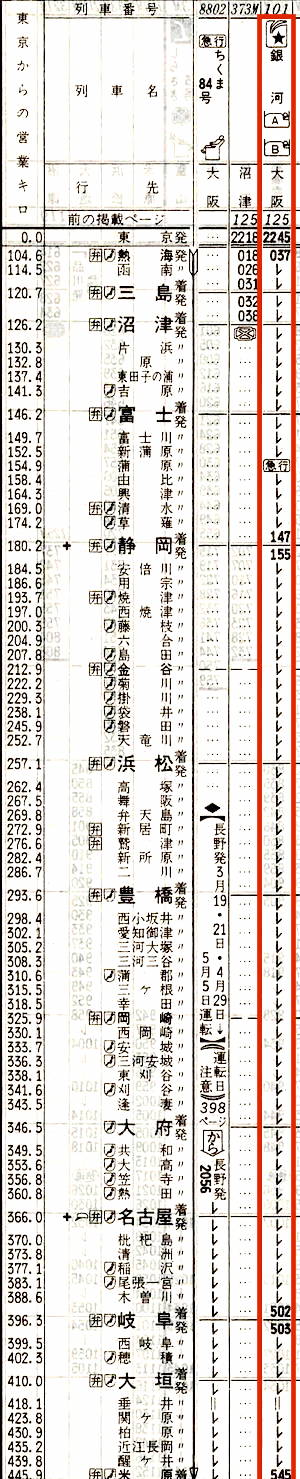 【寝台急行銀河】101:東京2245→2312横浜2313→0036熱海0057→0147静岡0155→0502岐阜0503→0545米原0547→0648京都0650→0728大阪【8時間43分】