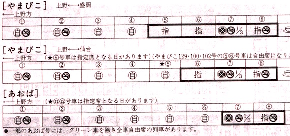 やまびこ・あおばともに12両編成です。禁煙車両は自由席2両、指定席2両であり、グリーン車は1/3両となっています。