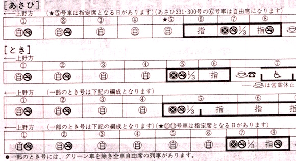 あさひは12両編成、ときは8両と12両の編成があります。禁煙車両は自由席2両、指定席2両(8両編成では1両)であり、グリーン車は1/3両となっています。