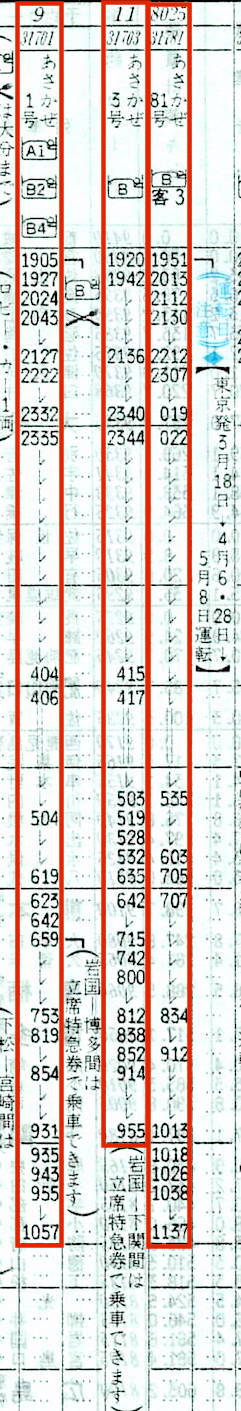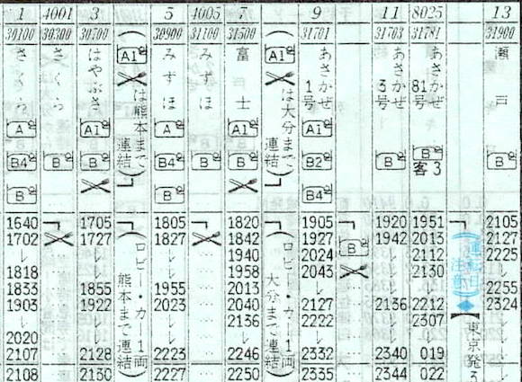 【寝台特急あさかぜ1号】9:東京1905→1926横浜1927→2125静岡2127→2332名古屋2335→0404岡山0406→0619広島0623→0931下関0935→1057博多【15時間52分】