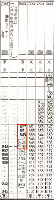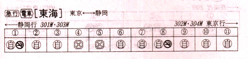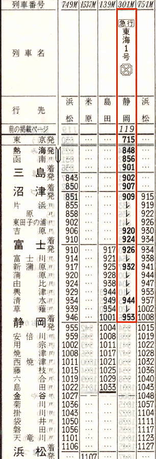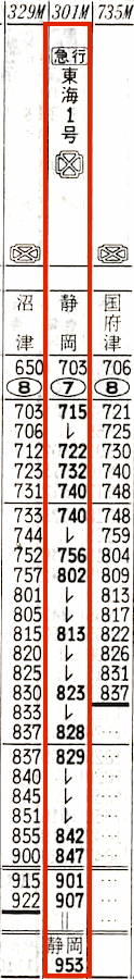 【急行東海1号】301M:東京0715→0740横浜0740→0828小田原0829→0847熱海0848→0953静岡【2時間38分】