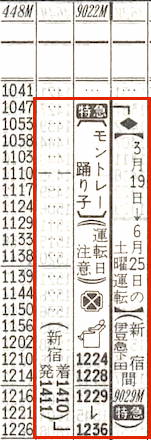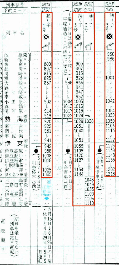 [特急踊り子3号]3023M:東京0900→0924横浜0924→1001小田原1001→1020☆熱海1023→1044伊東1051→1150伊豆急下田[2時間50分]、4023M:☆熱海1025→1038三島1040→1108修善寺[2時間08分]