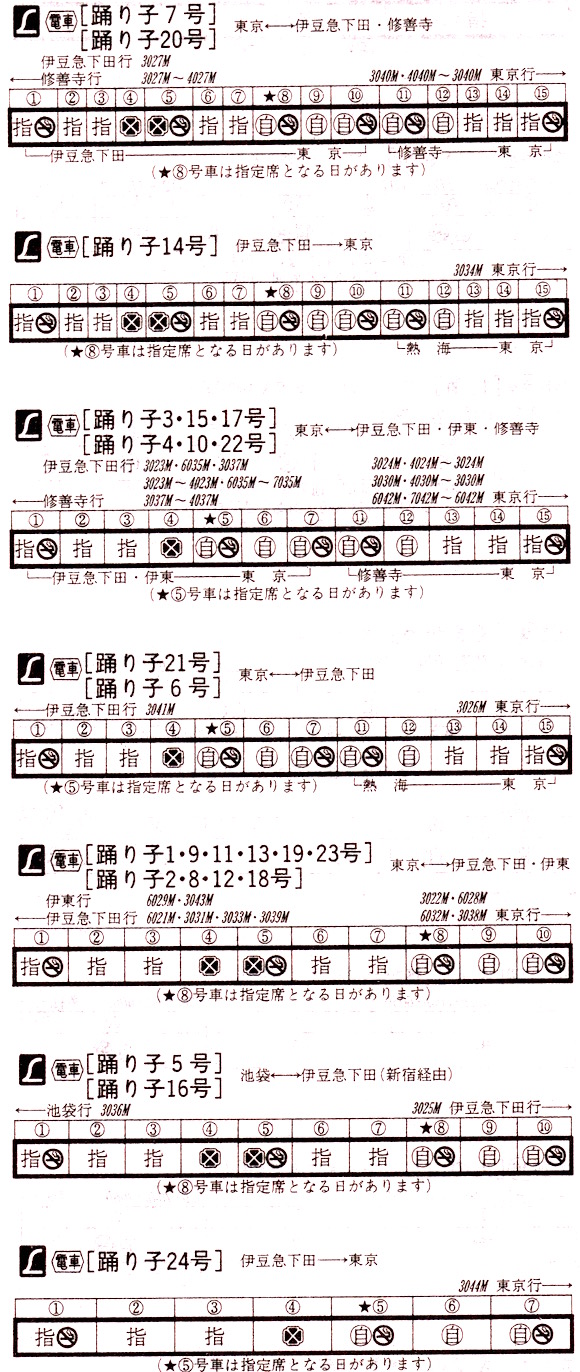 東京〜伊東・伊豆急下田行きのエル特急踊り子は定期9往復、臨時6往復と数多く走っています。修善寺行きは4本あります。踊り子5号は池袋→新宿→伊豆急下田となっています。