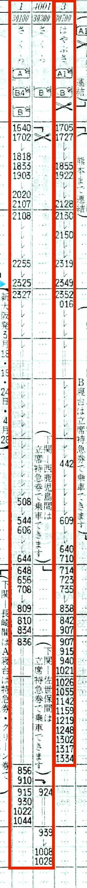 【寝台特急みずほ】5:東京1805→1826横浜1827→2022静岡2023→2223名古屋2227→0046大阪0048→0458広島0502→0806下関0810→0926博多0928→0953☆鳥栖0958→1109熊本【17時間04分】、4005:☆鳥栖1005→1204長崎【17時間59分】