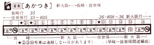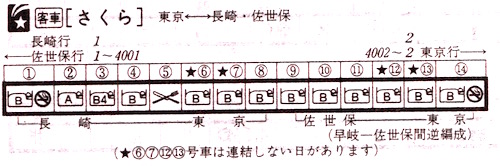 全14両で8両が長崎、6両が佐世保行きです。A寝台は長崎行きだけですが、佐世保にもかなり需要があったのですね。そして注目すべきは禁煙車両の少なさです。14両中、長崎行き1両、佐世保行き1両の2両しかありません。ほとんどの車両で喫煙が可能だったようです。