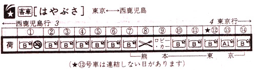 そして17時05分発の西鹿児島行きの寝台特急はやぶさ。全14両で、熊本から西鹿児島までは6両となります。A寝台は熊本で切り離されます。禁煙車両は全14両中わずか1両のみ。現在とは隔世の感があります。
