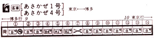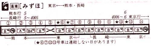 全14両で8両が熊本、6両が長崎行きです。A寝台は熊本行きのみです。東京〜長崎の所要時間はみずほの方がさくらより5分短くなっています。こちらも禁煙車両は熊本行き1両、長崎行き1両の2両のみです。
