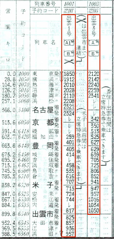 【寝台特急出雲3号】1003:東京2120→2141横浜2142→2339静岡2341→0342京都0350→0627豊岡0629→0806鳥取0808→0941米子0947→1050出雲市【13時間30分】