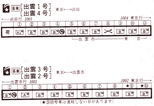 【寝台特急出雲1号】1001:東京1850→1911横浜1912→2109静岡2110→2321名古屋2324→0401豊岡0403→0535鳥取0537→0707米子0713→0817出雲市0825→0957浜田【15時間07分】