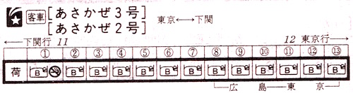 あさかぜ1号は14両編成(A寝台付き)で、3号は13両編成です。3号は広島から下関まで7両です。禁煙車両はやはり1両のみです。