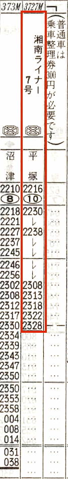 【湘南ライナー7号】3727M:東京2230→品川2238→大船2308→藤沢2313→辻堂2318→茅ヶ崎2322→2328平塚【58分】