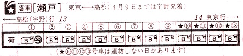 全13両すべてが高松まで行きます。すべてB寝台でA寝台はありません。禁煙車両は1両のみです。